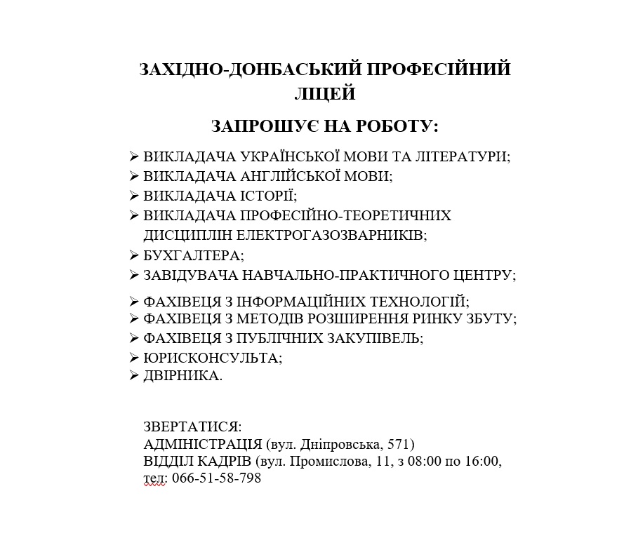 04.07.2025 Західно-Донбаський професійний ліцей запрошує на роботу!!!